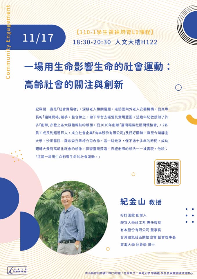 11/17(三) 紀金山教授【一場用生命影響生命的社會運動: 高齡社會的關注與創新】