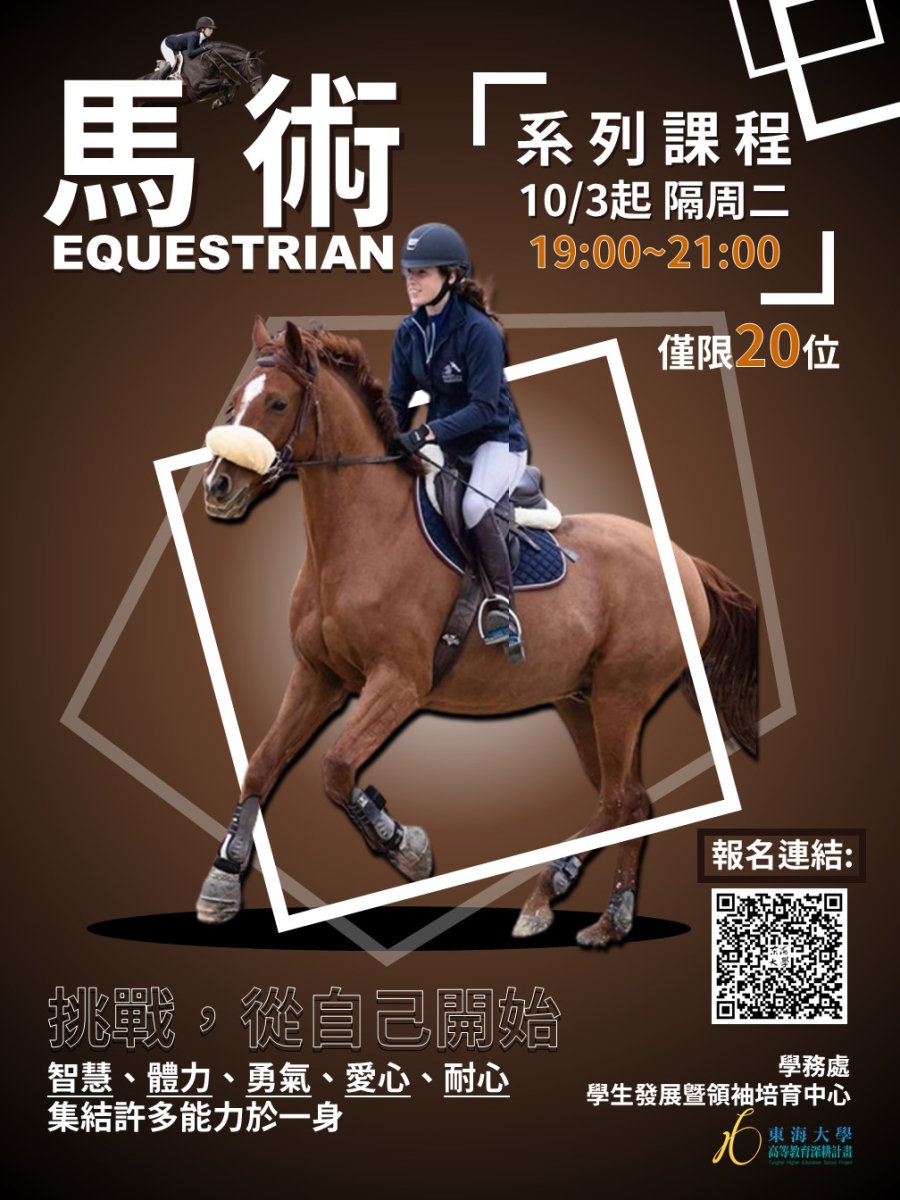 挑戰,從自己開始 智慧、體力、勇氣、愛心、耐心 集結許多能力於一身 時間:隔周二 19:00~21:00 地點:東海馬場 (限20人) 報名連結:https://event.ithu.tw/2023090105