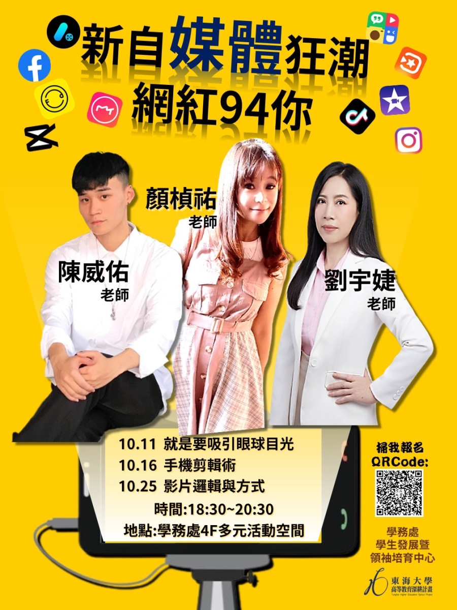 成為新一代具有跟得上新自媒體擁有綜合能力及影音技術,來吧來吧! 在這兒除了影音技術及面對鏡頭等實作培訓課程。也將藉由跨域彼此研習,一起籌組屬於東海學生影音平台製播團隊。 報名連結:https://event.ithu.tw/2023090111