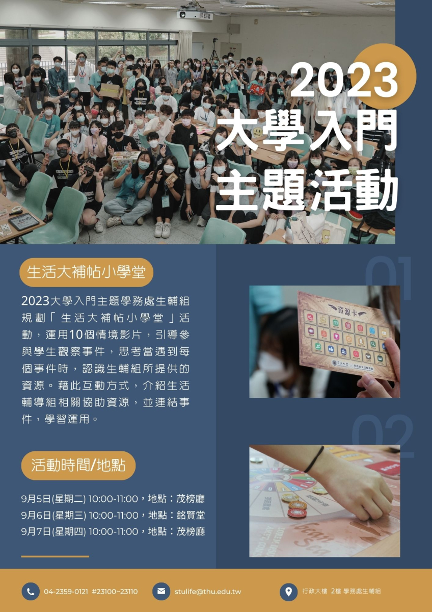023大學入門主題活動:生活大補帖小學堂2023大學入門主題學務處生輔組規劃「生活大補帖小學堂」活動,運用10個情境影片,引導參與學生觀察事件,思考當遇到每個事件時,認識生輔組所提供的資源。藉此互動方式,介紹生活輔導組相關協助資源,並連結事件,學習運用。